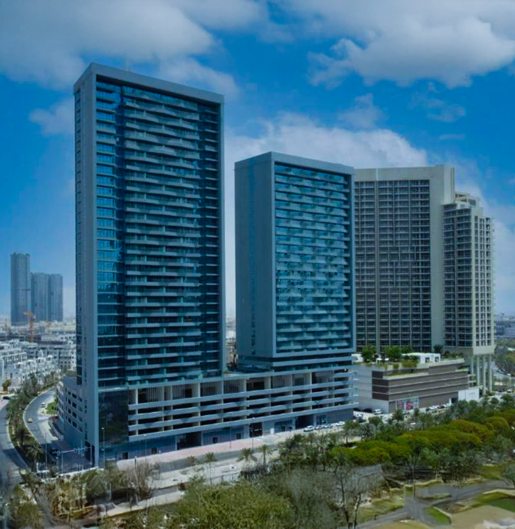 Bloom Heights is a high-rise residential project in Jumeirah Village Circle, featuring two modern towers connected by podiums, designed with flowing architectural lines and a distinctive wave pattern.