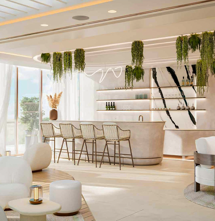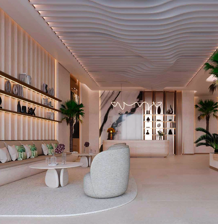 Positioned along the coastline in the heart of Dubai Island A, the project reflects a contemporary architectural identity that emphasizes openness, light, and spatial connectivity. The façade combines neutral tones with carefully selected finishes, creating a balanced and elegant residential environment.